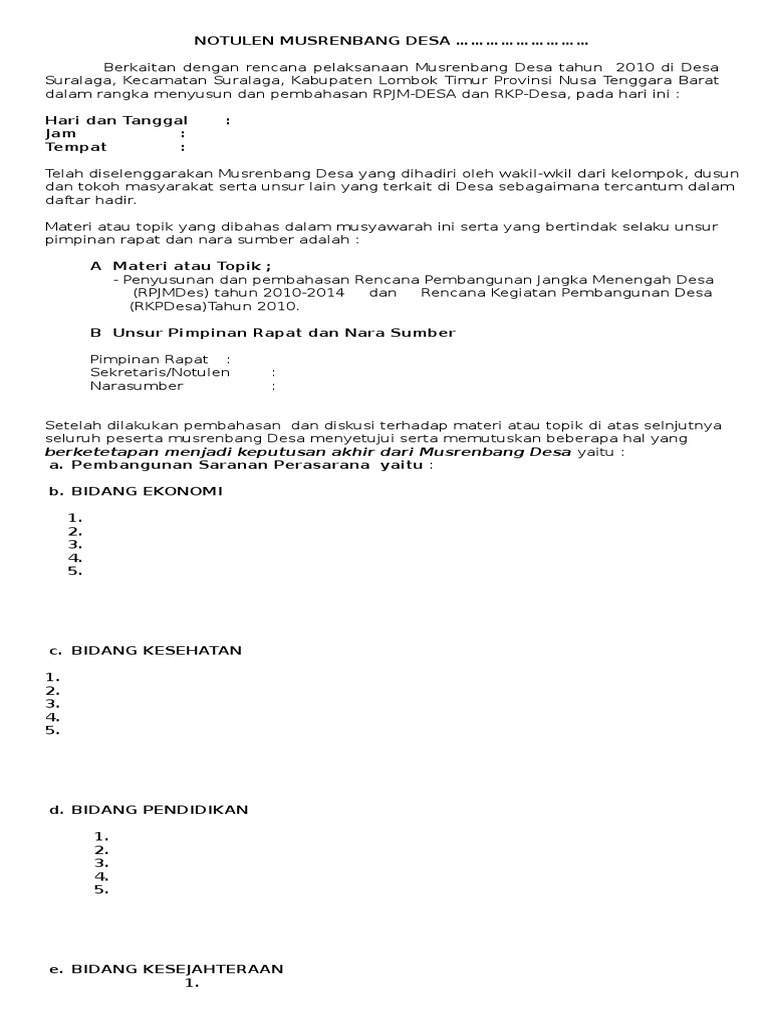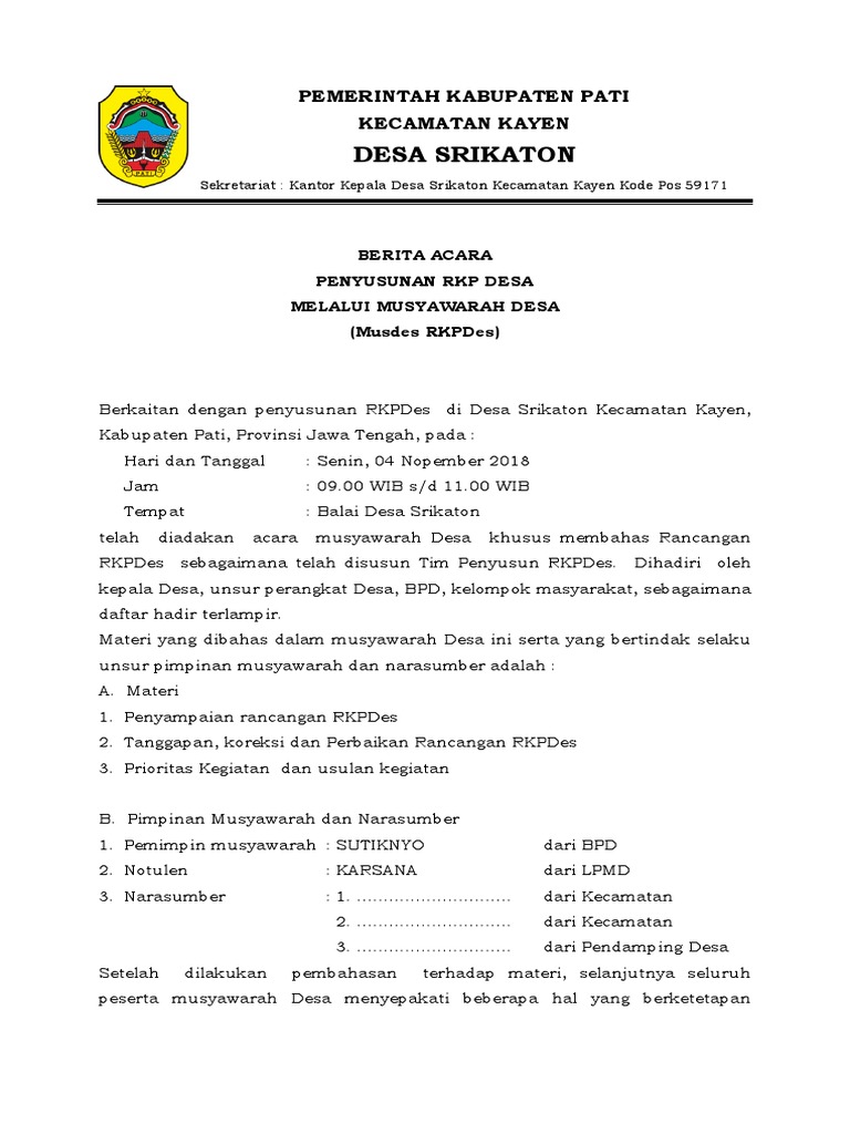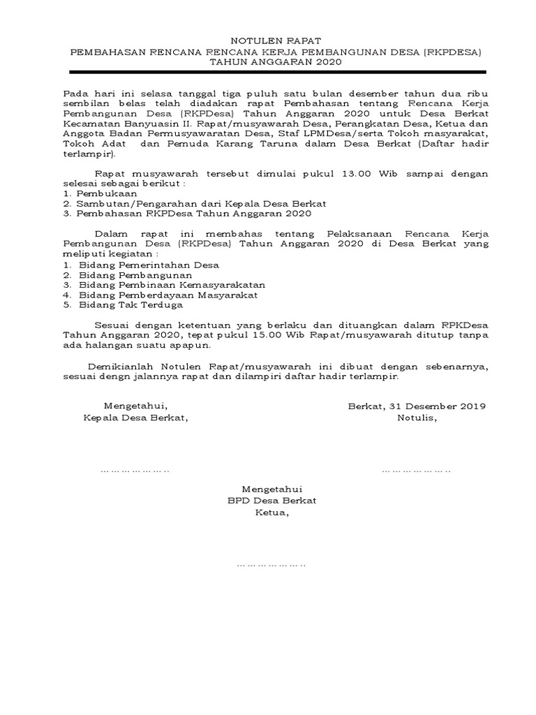 Notulen rapat dibuat untuk meninjau ulang hasil diskusi perusahaan. Musyawarah desa musdes rkpdes desa pegiringan tahun 2018. Samudi azkia nadia notulen rapat. Documents similar to contoh isian format penyusunan rkpdes. Berikut contoh sk kepala sekolah tentang tim akreditasi sekolah keputusan kepala (nama sekolah) nomor 1.